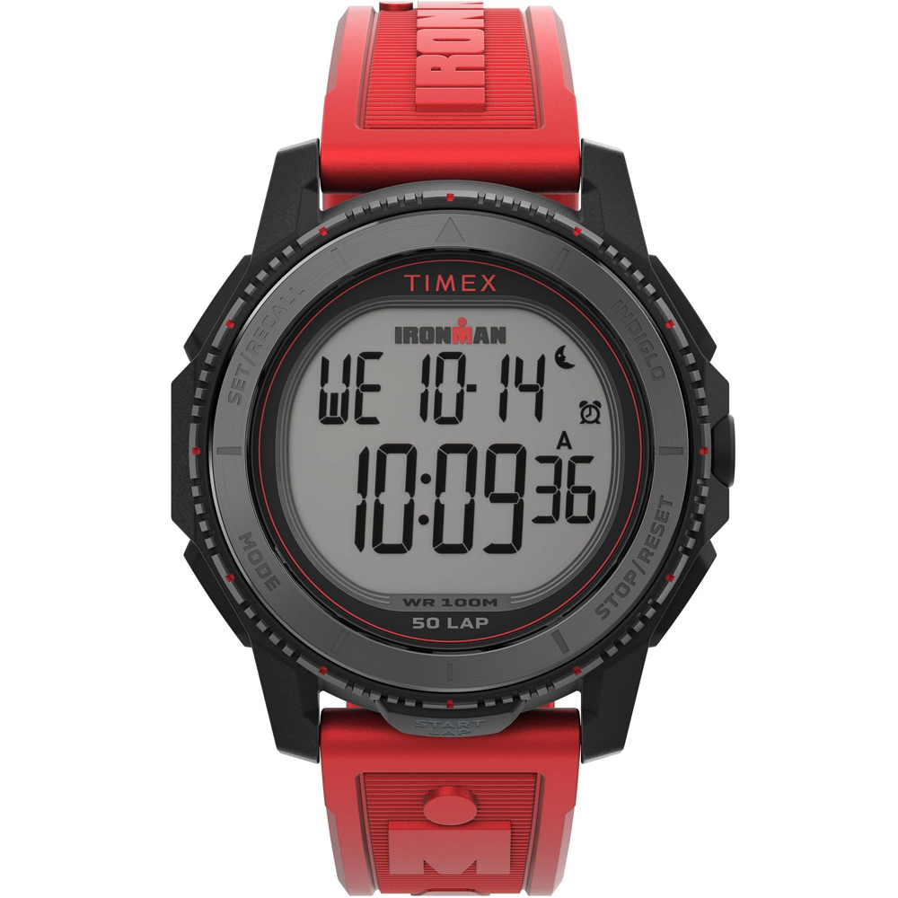 Timex IRONMAN Adrenaline TW5M57900 - водонепроницаемые цифровые часы 46,5 мм на красном ремешке. Ironman Adrenaline — это часы, придуманные и созданные спортсменами с учетом ваших целей. Timex упаковали множество функций в крутой спортивный дизайн: фиксированный безель из нержавеющей стали, ремешок с тиснением, хранение данных на 50 кругов и множество других функций, которые вы ожидаете от TIMEX® IRONMAN®: классическая подсветка INDIGLO®, таймер, ежедневный будильник, водонепроницаемость 100 м. Эти часы дают то, что вам нужно.
