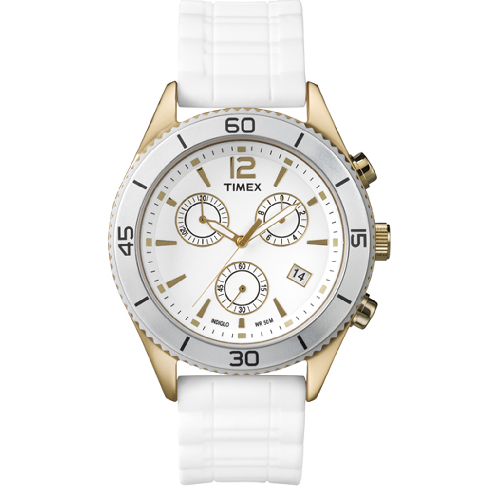 Мужские часы-хронограф 41 мм Timex SPORT CHRONO с легким алюминиевым корпусом и белым силиконовым ремешком. Спортивная стилистика безеля и ремешка отлично переплетается с элегантными чертами отделки, например, золотистым PVD на корпусе, заводной головке и кнопках, которое перекликается с аналоговой индикацией в тон отделке. Добавьте к этому фирменную подсветку Indiglo – и идеальные повседневные часы готовы.