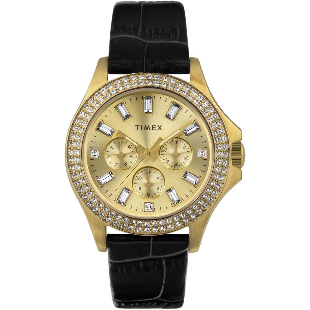 Timex KAIA Multifunction 40мм / жіночий / кварцовий / золотистий циферблат із кристалами / чорний шкіряний ремінець / 50м / Мінеральне скло / Золотистий корпус із кристалами / Ремінець-20мм TW2W10900 Гарантія: 1 рік