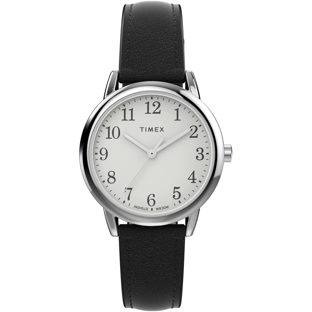 Timex EASY READER Classic 30мм / женские / кварцевые / белый циферблат / черный кожаный ремешок / 30м / Минеральное стекло / Серебристый корпус / Ремешок-14мм TW2W32500 Гарантия: 1 год