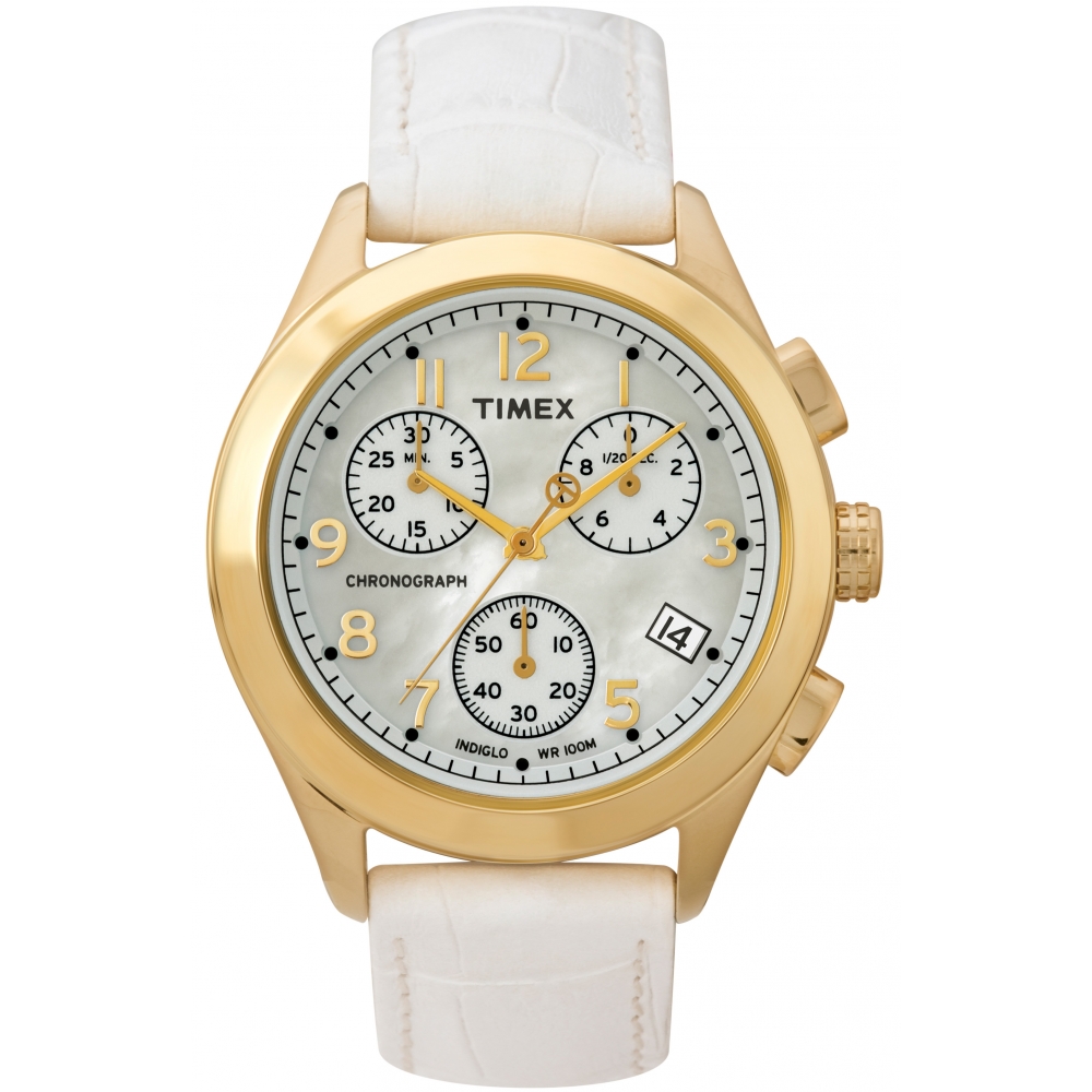 Timex T Chrono женские / кварцевые / белый перламутровый циферблат / белый кожаный ремешок / 100м / Минеральное стекло / GP / 36мм / Ремешок-18мм / Box14 T2M713